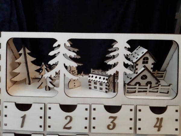 Calendrier de l'avent en bois modèle maison. Possède 24 tiroirs où vous pourrez y insérer des chocolats ou bonbons, idéal pour attendre Noël. Plusieurs décorations sur le dessus, maisonnettes, bonhomme de neige, traîneau père Noël, petit village, sapins...